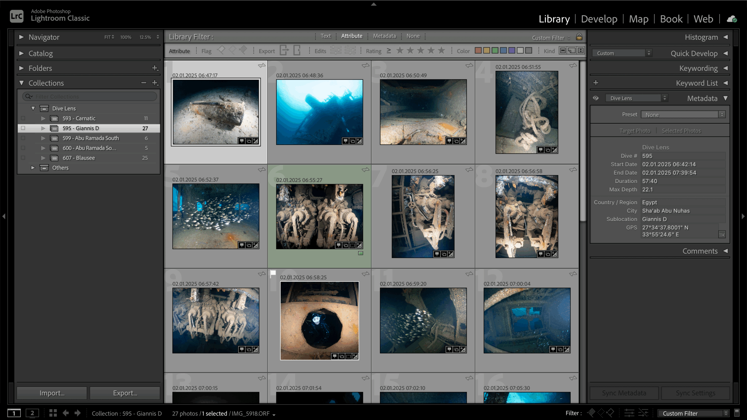 DiveLens helps you stay organized by automatically creating a Lightroom collection for each of your dives, using the start and end time to group your photos seamlessly. It also adds dive metadata like dive site, depth, and dive number to your selected images.