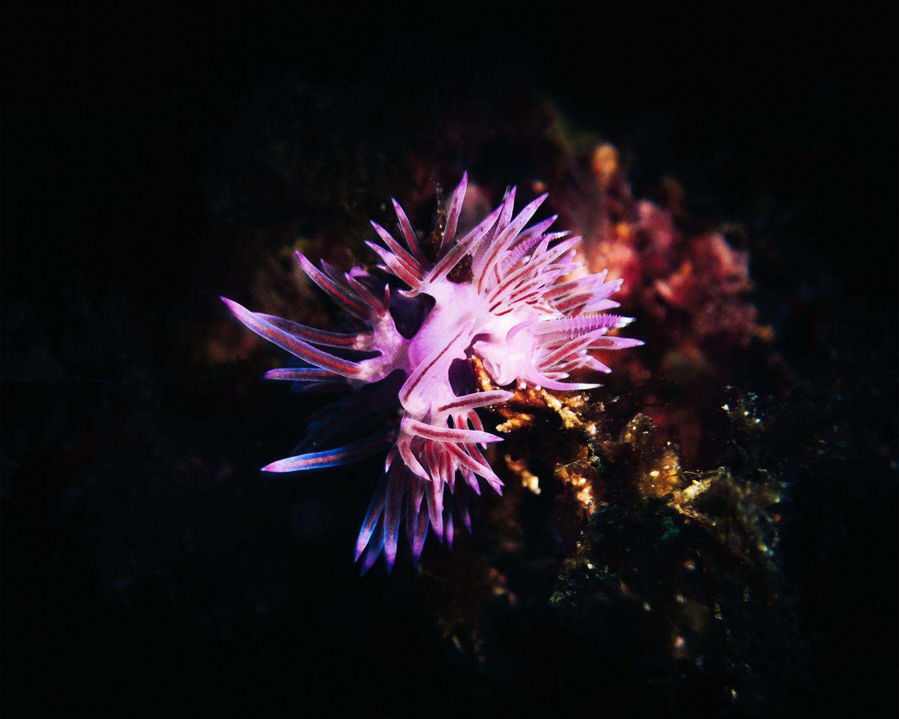 This delicate nudibranch reveals its translucent beauty in the Mediterranean depths. A living jewel showcasing the hidden artistry of marine life.